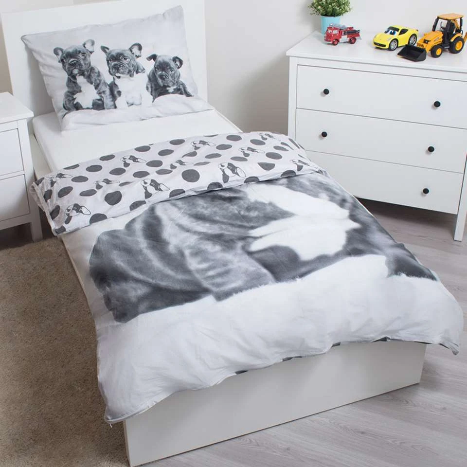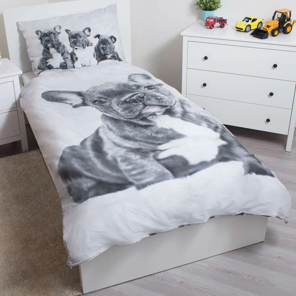Animal Pictures Dekbedovertek, Bulldog. Bulldogs zijn al schattig op zichzelf, maar puppy’s overtreffen de schattigheidsfactor van elk hondenras. Deze kleine bulldog pups zullen het hart van een hondenliefhebber doen smelten. Het eenpersoons dekbedovertrek is van 100% katoen gemaakt, wat betekent dat de stof goed ademt en dus prettig is om onder te slapen. Dit lieve dekbedovertrek is het ideale cadeau voor een bulldog fan!