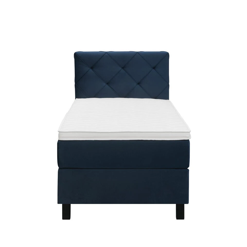 Boxspring Liv is een boxspring met een afmeting van 90×200 cm. Deze prachtige boxspring is bekleed met een velvet blauwe stof en heeft een romantische uitstraling met een geruit hoofdbord. De Liv geruit is uitgerust met een pocketveringmatras en daarnaast ook nog een koudschuim topdekmatras voor extra comfort. Het pocketveringmatras is omkeerbaar, bestaande uit zowel een medium- als een stevige kant. Hierdoor kun je zelf kiezen wat voor jou het meest comfortabel ligt. Â