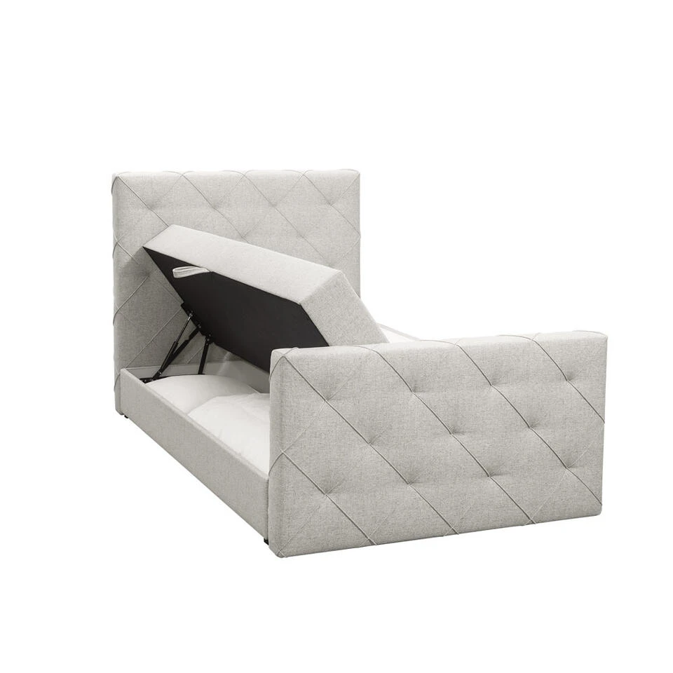 Boxspring met opbergruimte Liv is een boxspring met een afmeting van 120×200 cm. Deze prachtige boxspring is bekleed met een fijn geweven ecru stof en heeft een romantische uitstraling met een geruit hoofd- en voetbord. De Liv geruit is uitgerust met pocketveringmatrassen en daarnaast ook nog een koudschuim topdekmatras voor extra comfort. Het pocketveringmatras is omkeerbaar, bestaande uit zowel een medium- als een stevige kant. Hierdoor kun je zelf kiezen wat voor jou het meest comfortabel ligt.