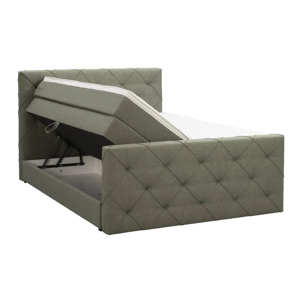 Boxspring met opbergruimte Liv is een boxspring met een afmeting van 160×200 cm. Deze prachtige boxspring is bekleed met een fijn geweven groene stof en heeft een romantische uitstraling met een geruit hoofd- en voetbord. De Liv geruit is uitgerust met twee pocketveringmatrassen en daarnaast ook nog een koudschuim topdekmatras voor extra comfort. Het pocketveringmatras is omkeerbaar, bestaande uit zowel een medium- als een stevige kant. Hierdoor kun je zelf kiezen wat voor jou het meest comfortabel ligt.