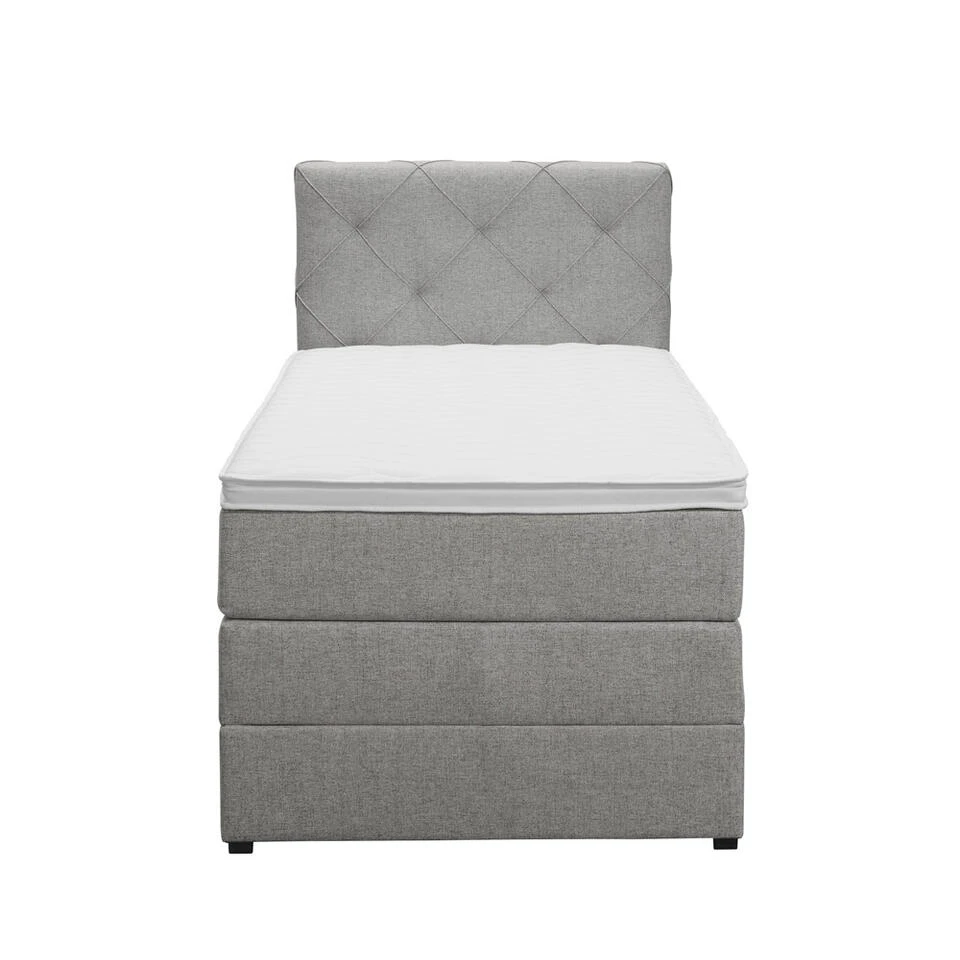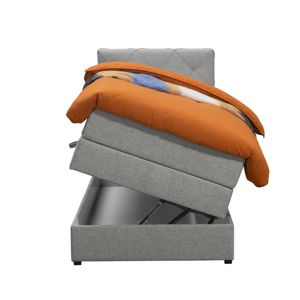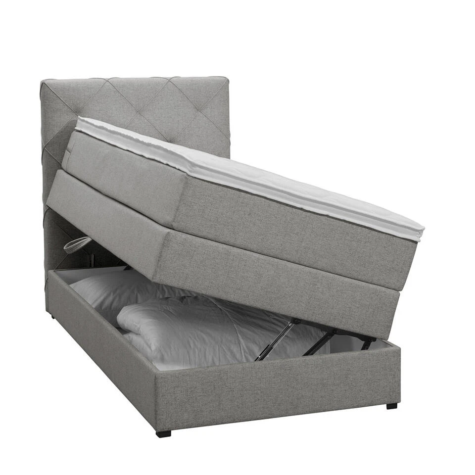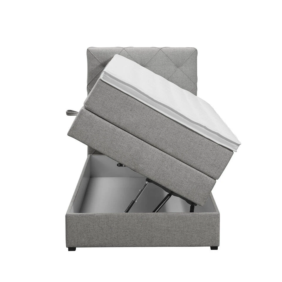 Boxspring met opbergruimte Liv is een boxspring met een afmeting van 90×200 cm. Deze prachtige boxspring is bekleed met een fijn geweven lichtgrijze stof en heeft een romantische uitstraling met een geruit hoofdbord. De Liv geruit is uitgerust met pocketveringmatrassen en daarnaast ook nog een koudschuim topdekmatras voor extra comfort. Het pocketveringmatras is omkeerbaar, bestaande uit zowel een medium- als een stevige kant. Hierdoor kun je zelf kiezen wat voor jou het meest comfortabel ligt.