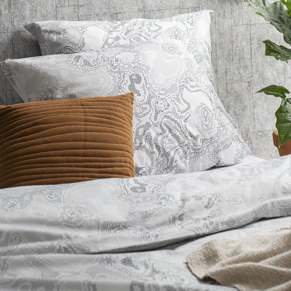 Het dekbedovertrek Charon van Cinderella heeft een all-over print uitgevoerd in een lichtgrijze kleur. Het ontwerp is opgebouwd uit pixels waardoor er een bijzonder patroon ontstaat. Hiermee zet je een strakke en unieke look neer in jouw slaapkamer.