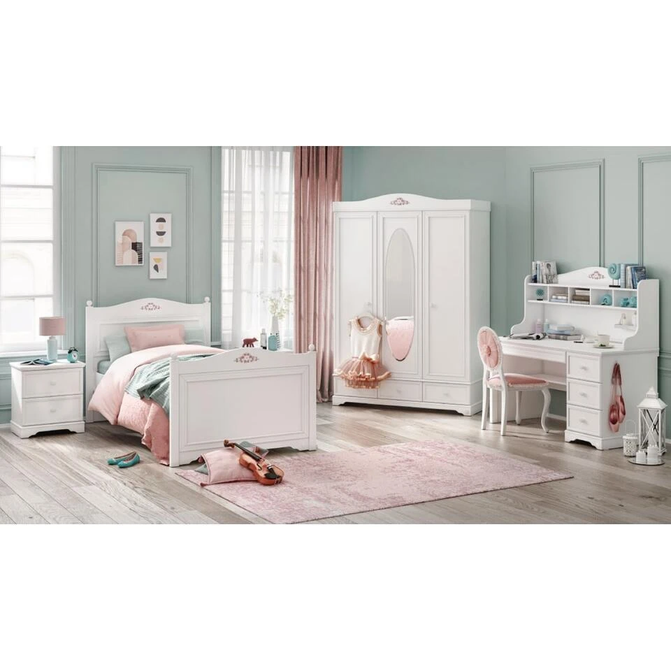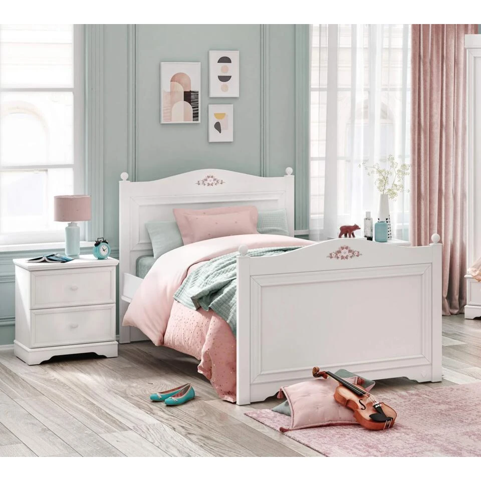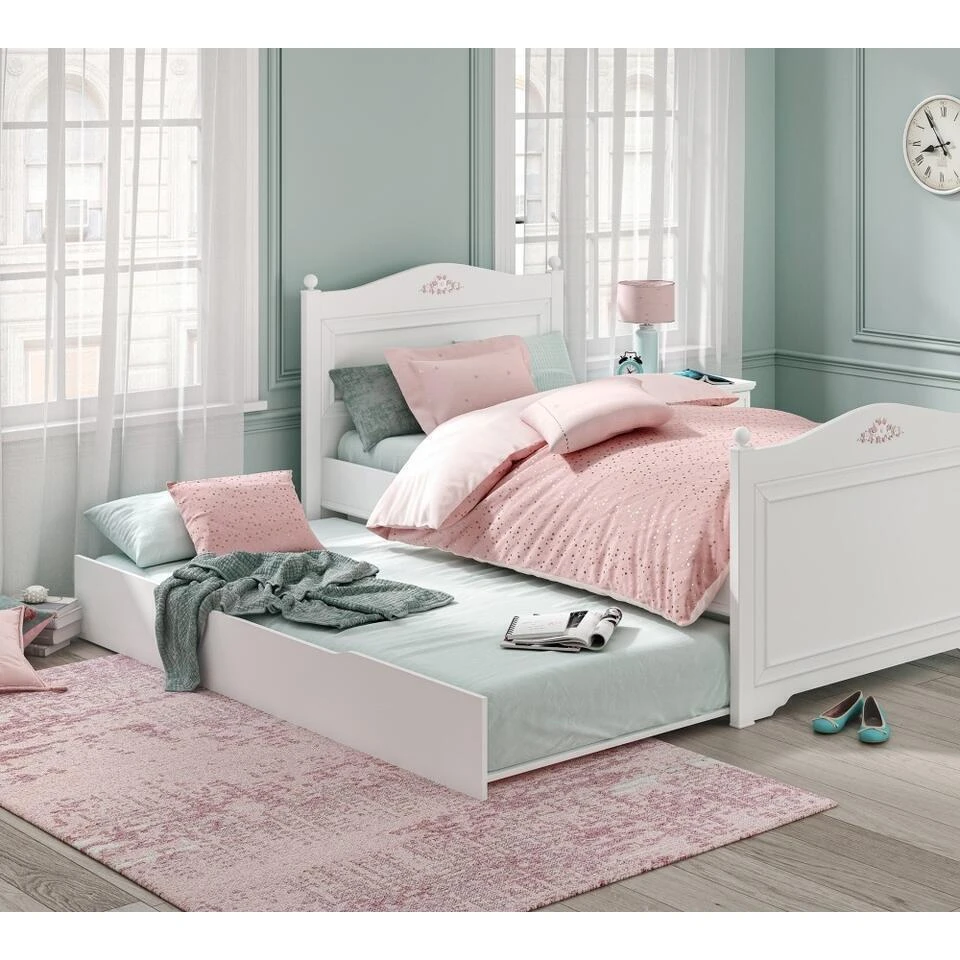 Het meisjesbed is prachtig afgewerkt met bloemdetails en luxe poten en biedt de mogelijkheid tot uitbreiding met een bedlade voor extra slaap- of opbergruimte.
