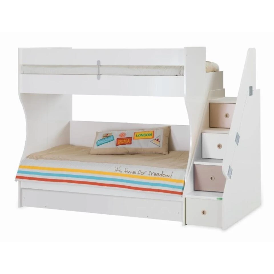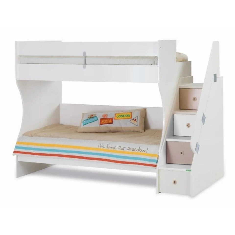 Het Tivoli witte stapelbed is strak afgewerkt en past in iedere kinderkamer. Er zijn tal van combinaties mogelijk met de Tivoli kinderkamer. De trap kan zowel aan de linker- als aan de rechterkant gemonteerd worden. In de treden van de trap zitten opbergladen. Optioneel kunt u er een bedlade bijbestellen die te gebruiken is als logeerbed of opberglade voor nog meer opbergruimte.