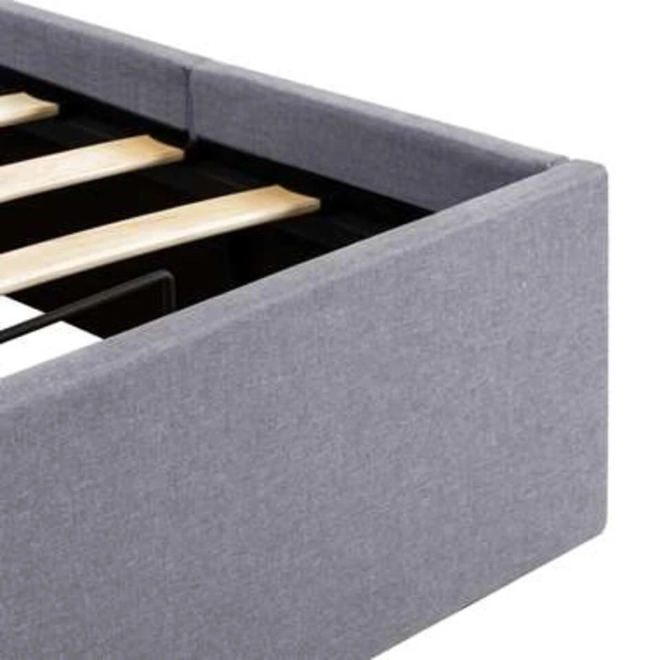 Het gepoedercoat stalen frame en de multiplex lattenbodem dragen bij aan de stevigheid en duurzaamheid van het bed. Dit opbergbed is bekleed met duurzame stof, ziet er uitnodigend uit en is gemakkelijk te onderhouden. Dit product is eenvoudig te monteren. Dit slaapkamermeubel is geschikt voor een matras van 90 x 200 cm.