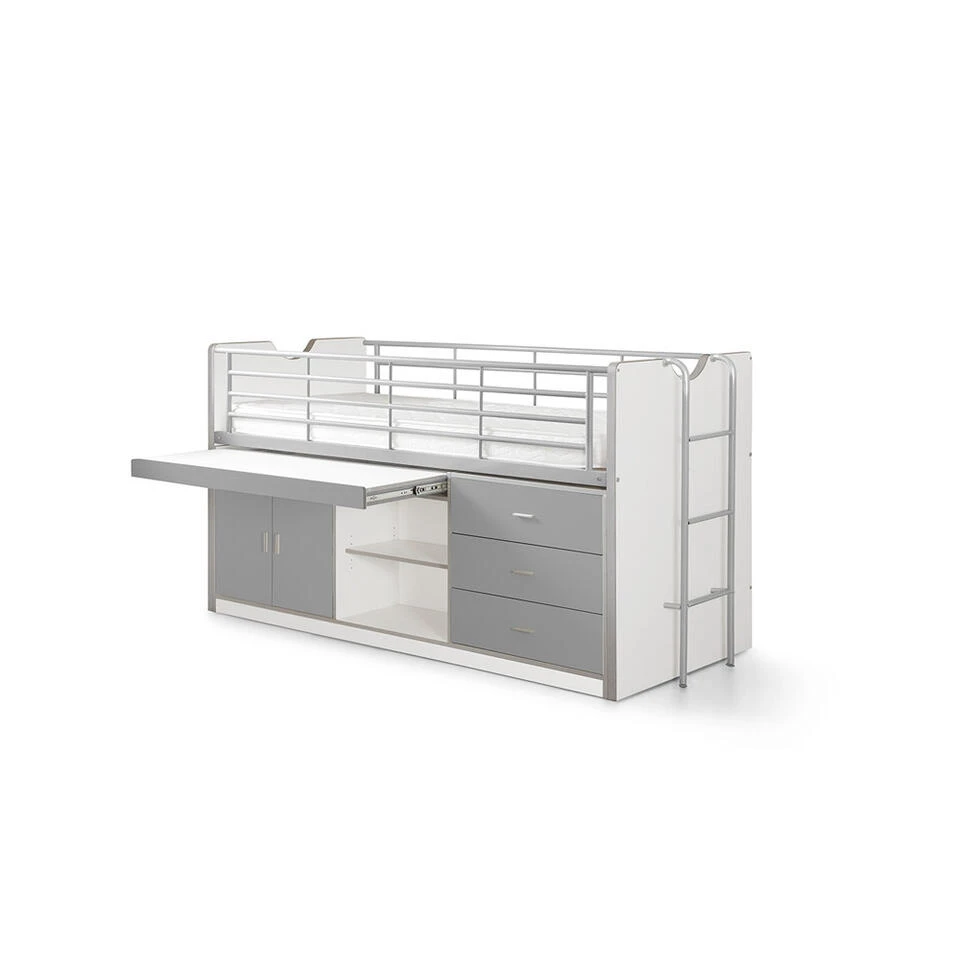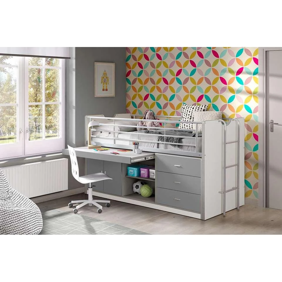 Vipack halfhoogslaper Bonny beschikt over een uitschuifbaar bureau en praktische opbergkastjes. Het kinderbed is vervaardigd uit een combinatie van kwalitatieve E1-vezelplaat en metaal. De lattenbodem wordt meegeleverd en kan gecombineerd worden met de standaard matrasmaat 90×200 cm.