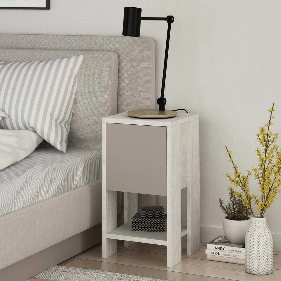 Met een effen kleurenconcept voegt dit nachtkastje een vleugje verfijning toe aan je slaapkamer. De combinatie van wit en licht mokka creëert een harmonieuze mix die bij elk interieur past. Of je stijl nu eigentijds of traditioneel is, dit nachtkastje past moeiteloos in je bestaande inrichting.