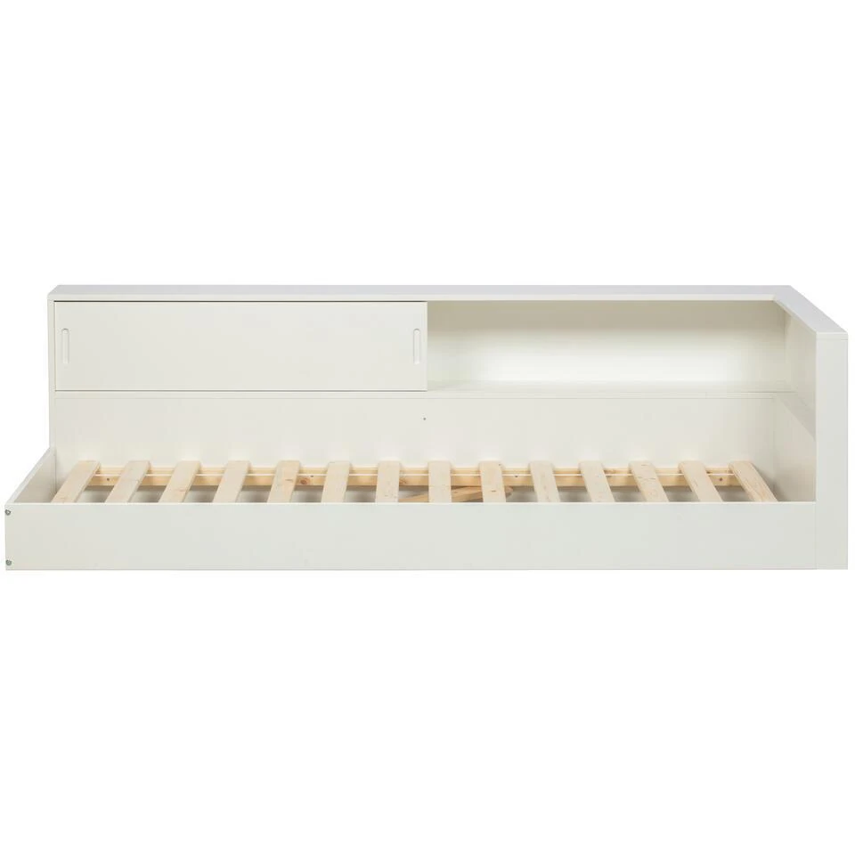 Het Connect hoekbed grenen betongrijs is een eigen ontwerp uit de collectie van het Nederlandse merk WOOOD. Het bed is geschikt voor 1-persoon en heeft de matrasmaat 90×200 cm. De vorm van het bed loopt in een hoek. Het bed heeft wel een hoofdbord en een kast langs de hele breedte van het bed, inclusief schuifdeur en geen voetbord. Het bed heeft als het ware een ingebouwd nachtkastje.
