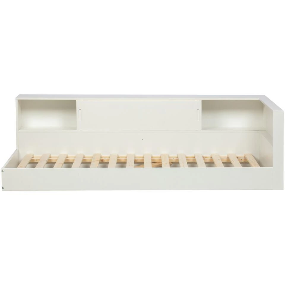 De twee opbergvakken achter de schuifdeur hebben een breedte van 104 cm en hoogte van 26 cm. De hoogte waar het matras op komt te liggen is 17 cm.