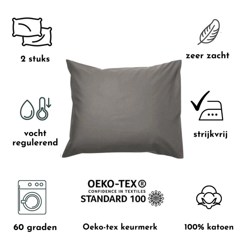 Zavelo kussenslopen van stevig katoen, verkrijgbaar in 9 trendy kleurtjes. De maat 60 x 70 cm is de standaardmaat voor Nederlandse hoofdkussens. De set bestaat uit twee kussenslopen met een effen kleur. Goede kwaliteit 100% katoen en strijkvrij. De kussenslopen zijn vochtabsorberend en warmteregulerend en beschermd je kussen tegen vuil en vocht. Simpel en tijdloos, maar toch ook verfijnd en luxe.